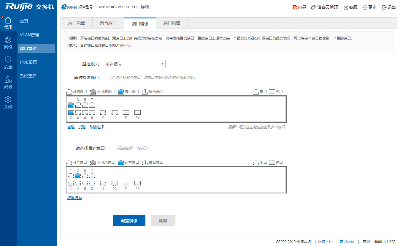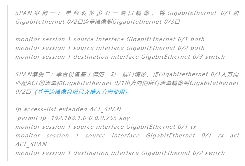 SPAN是本地端口镜像用于在单台设备进行一对一端口镜像或多对一端口镜像,将一个或多个端口的流量复制到另外一个端口上,并且还可以在此基础上添加ACL匹配数据流达到更精细化的基于流的端口镜像,此外还可以通过交换机的WEB页面配置SPAN。