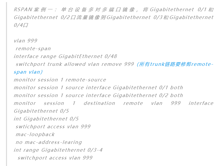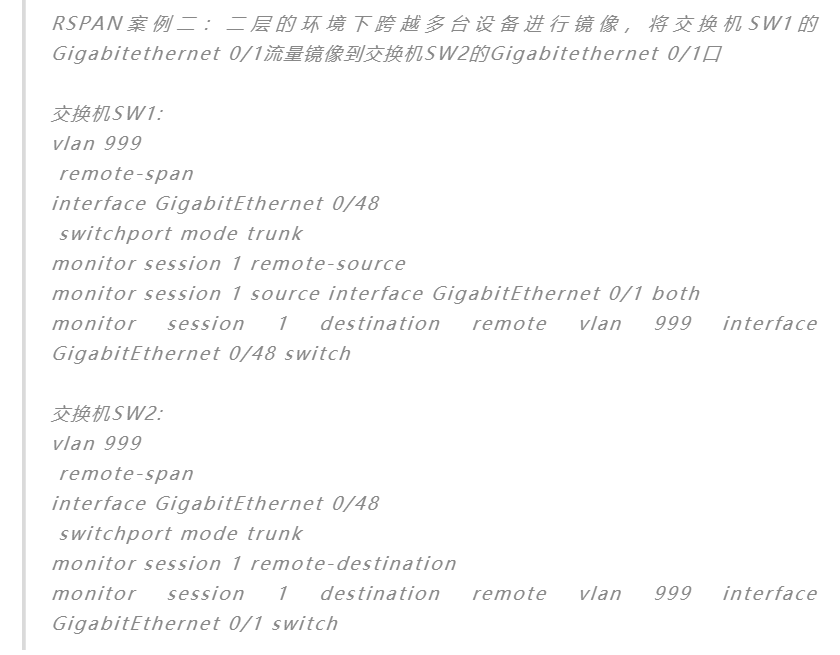 RSPAN是远程端口镜像目前有两种使用场景, 第一种是用于单台设备进行一对多端口镜像或者多对多端口镜像,第二种用于在二层的环境下跨越多台设备进行端口镜像。