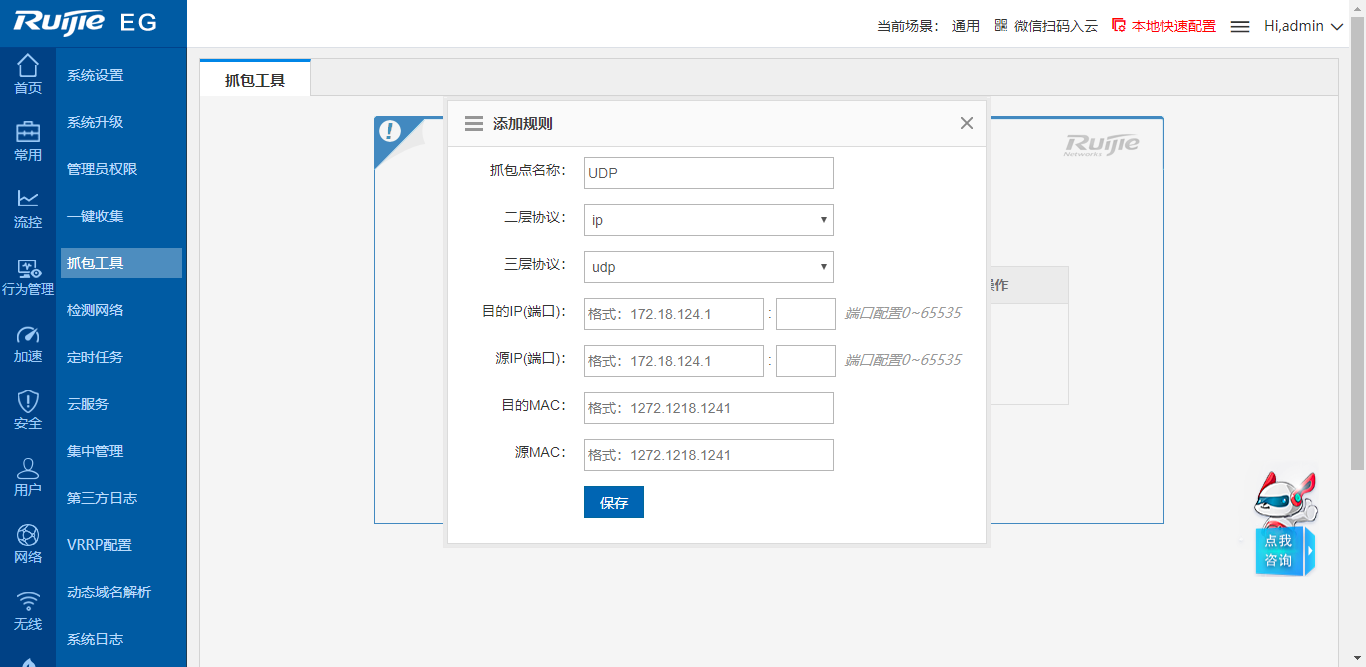 (1)在EG的WEB页面点击“高级-抓包工具”打开“抓包诊断工具”(老版本EG点击“高级-一键收集-抓包诊断工具”)