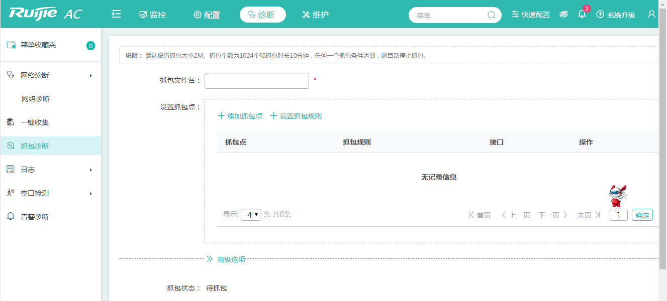 第一种方法是使用PCAP功能在AC的WEB页面上进行抓包。点击“诊断-抓包诊断”进入报文抓包工具,抓包步骤参考上小节EG的WEB页面抓包步骤此处不在赘述。需要注意的是AC的每次抓取报文大小与EG有所不同,AC默认抓包达到2MB或抓包个数为1024个报文或抓包时长10分钟,任意一个条件达到则自动停止抓包。目前版本的AC已支持WEB页面上抓包,如果你使用的AC版本不支持WEB页面上抓包可升级软件版本或使用第二种方法端口镜像功能进行报文捕获。