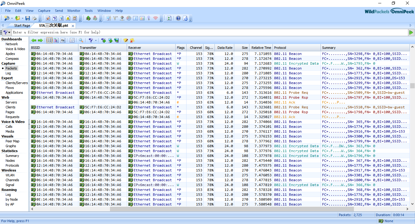 使用Omnipeek进行无线空口抓包是目前常用的方法,需要注意的是Omnipeek只支持部分无线网卡捕获无线空口报文,支持的无线网卡型号可在Omnipeek官网上查询,同时还需要安装特殊的无线网卡驱动才可以捕获到无线空口报文。