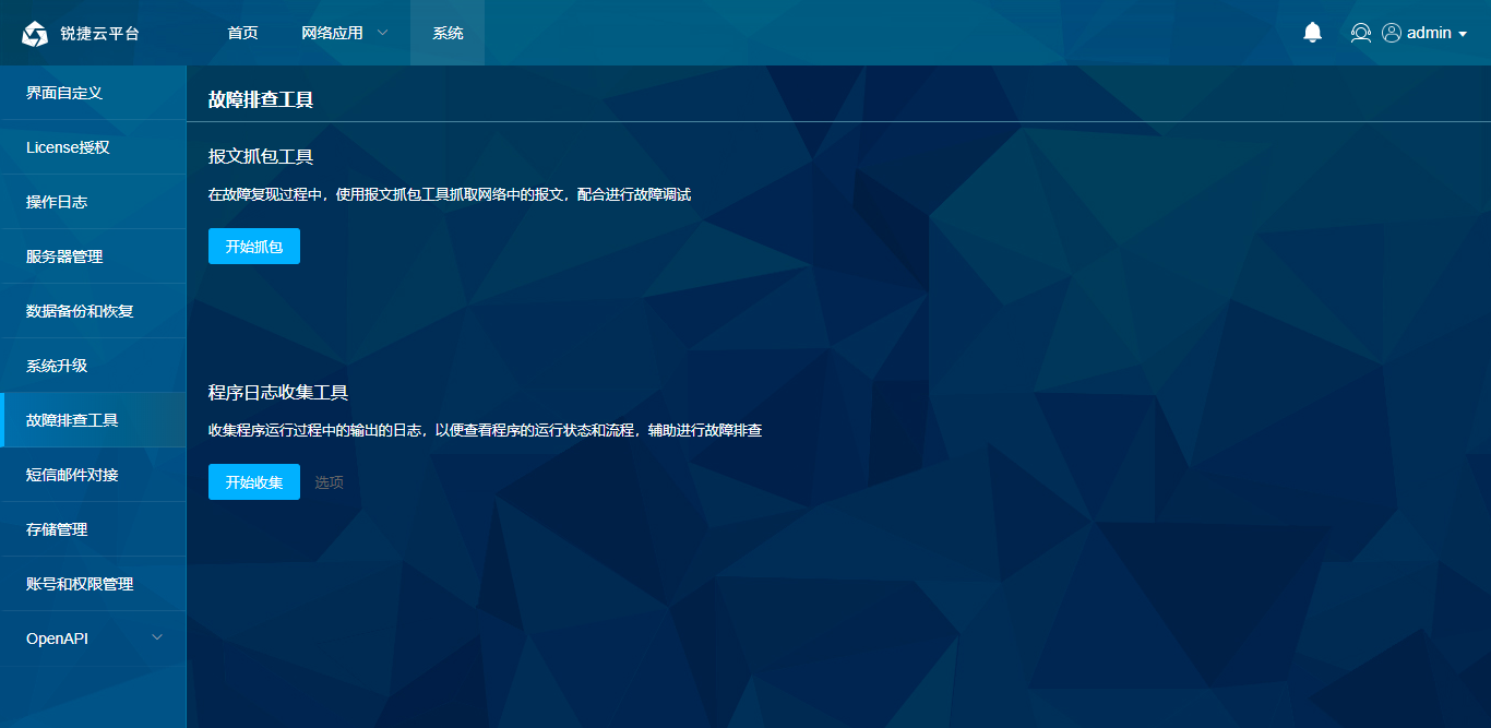 在MCP的WEB页面下进行报文捕获是比较常用的方法,点击“系统-故障排查工具”(老版本MCP点击“系统配置-日志收集”)进入报文抓包工具,点击“开始抓包”抓取网络中的报文,停止后可以直接将报文下载进行分析。
