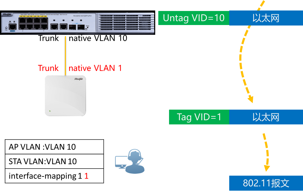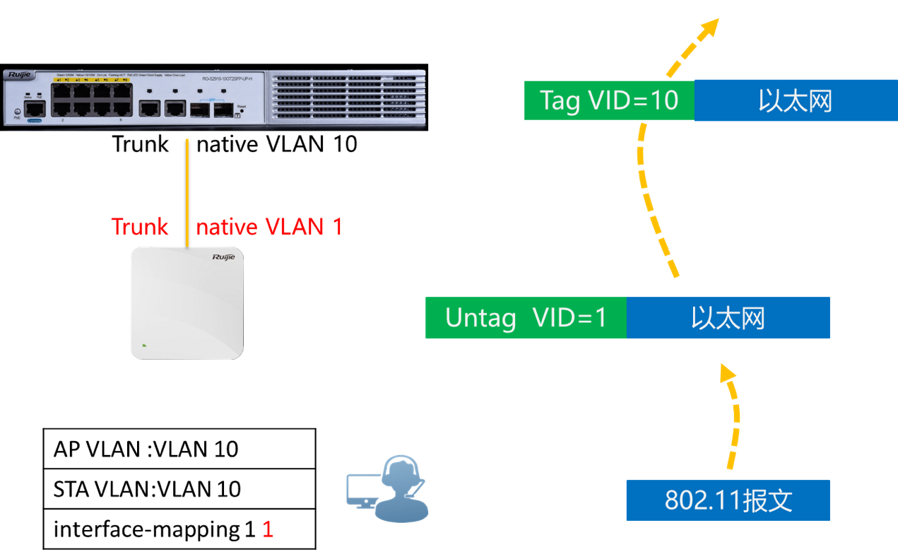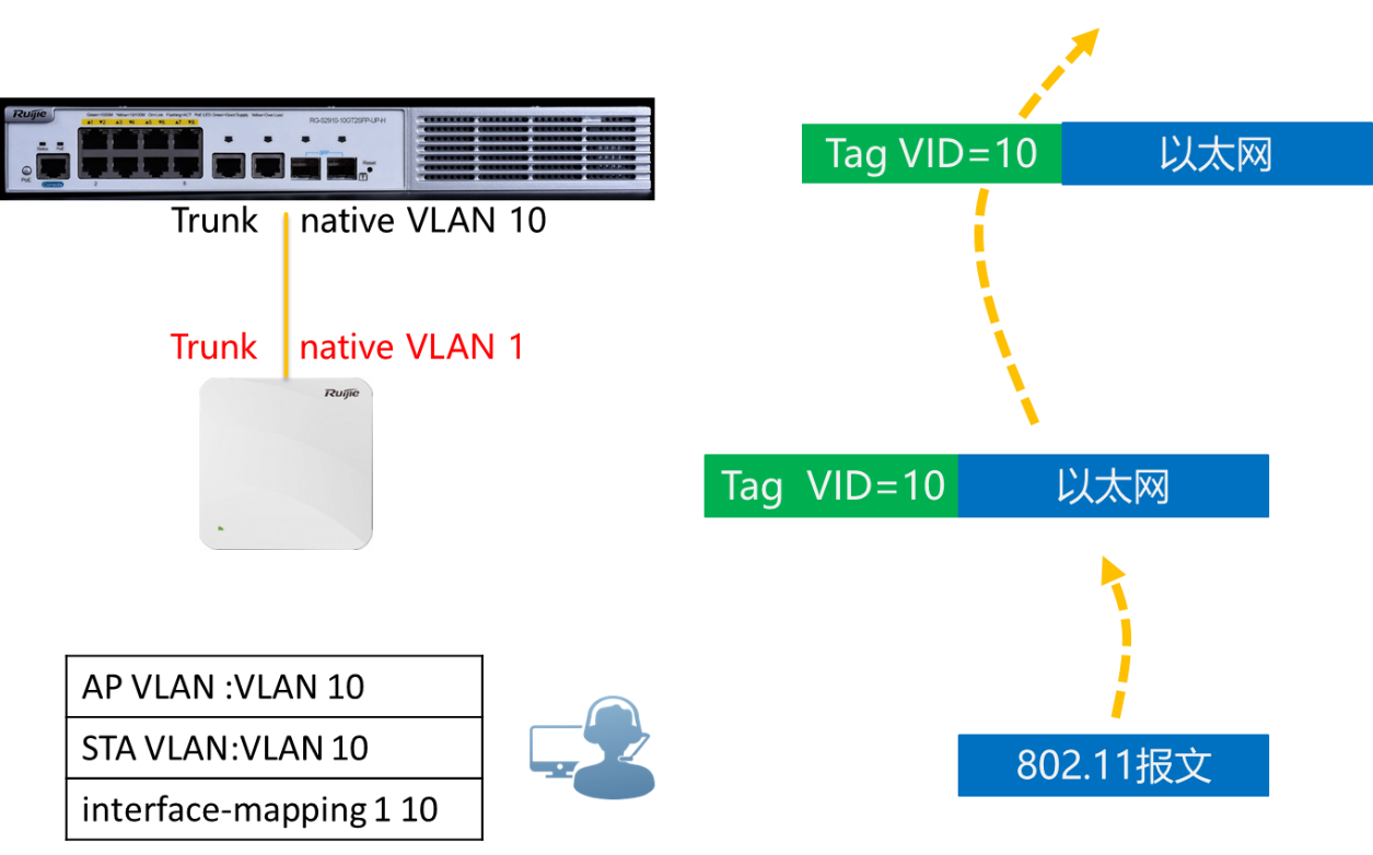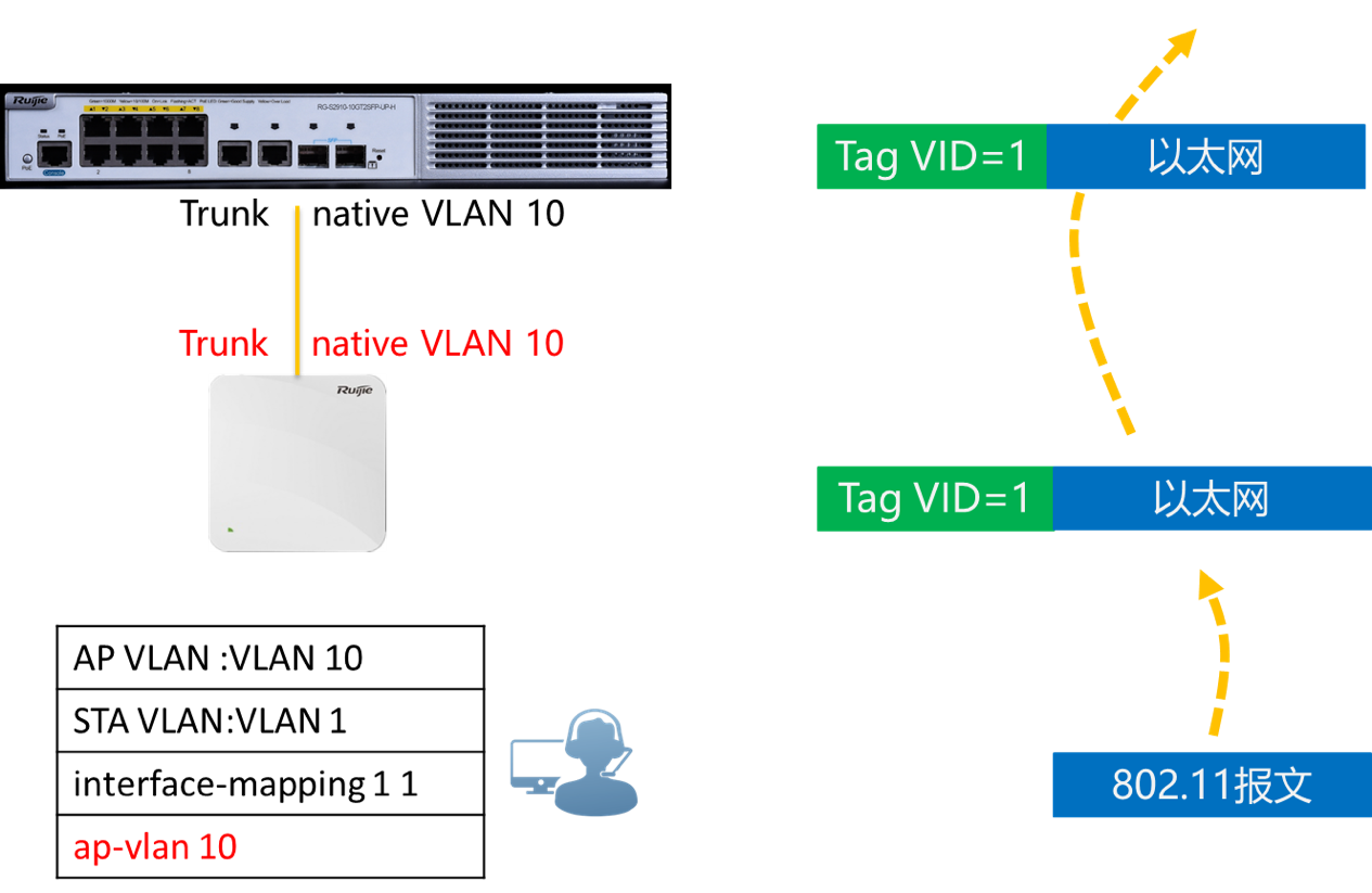 第二个方法是将用户的 VLAN改为1,修改后上行数据AP以UNTAG 1标签转发,到达交换机后,交换机对不带TAG的帧,打上Native VLAN 10的标签,然后正常转发。