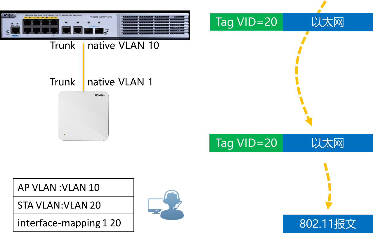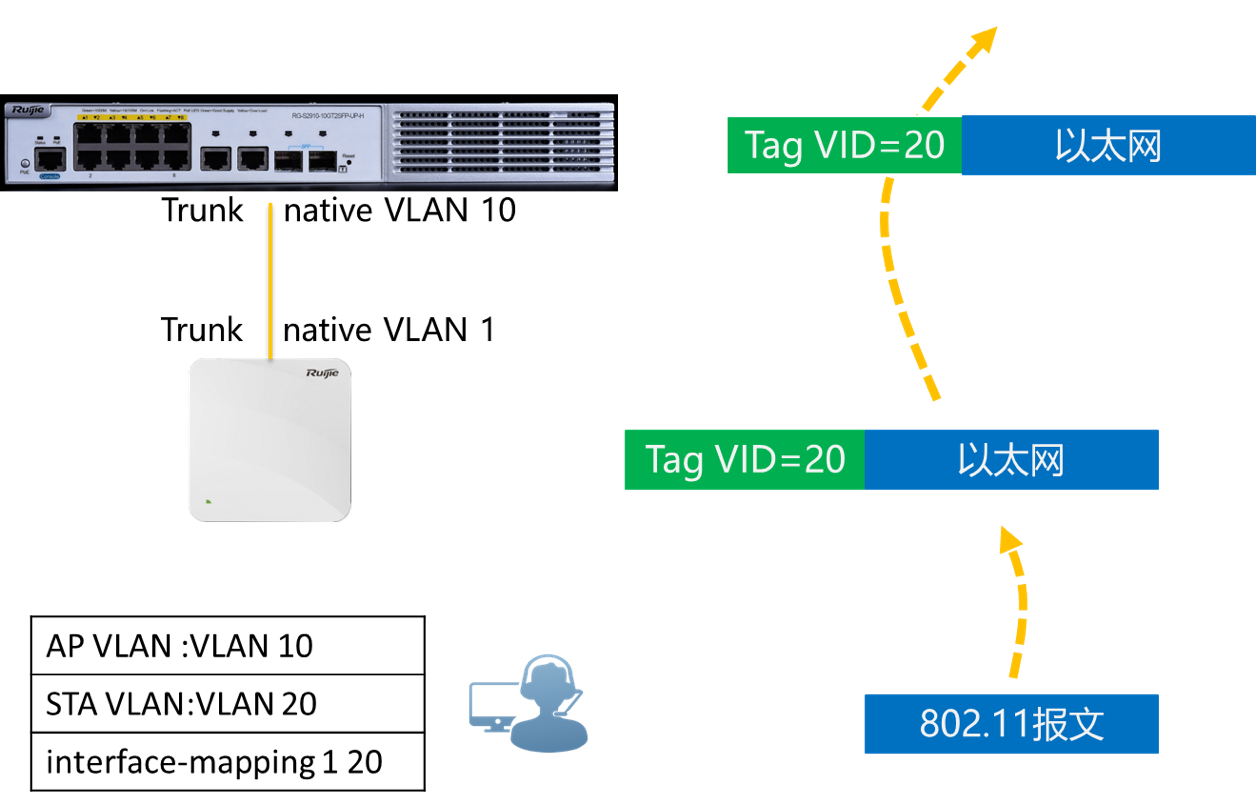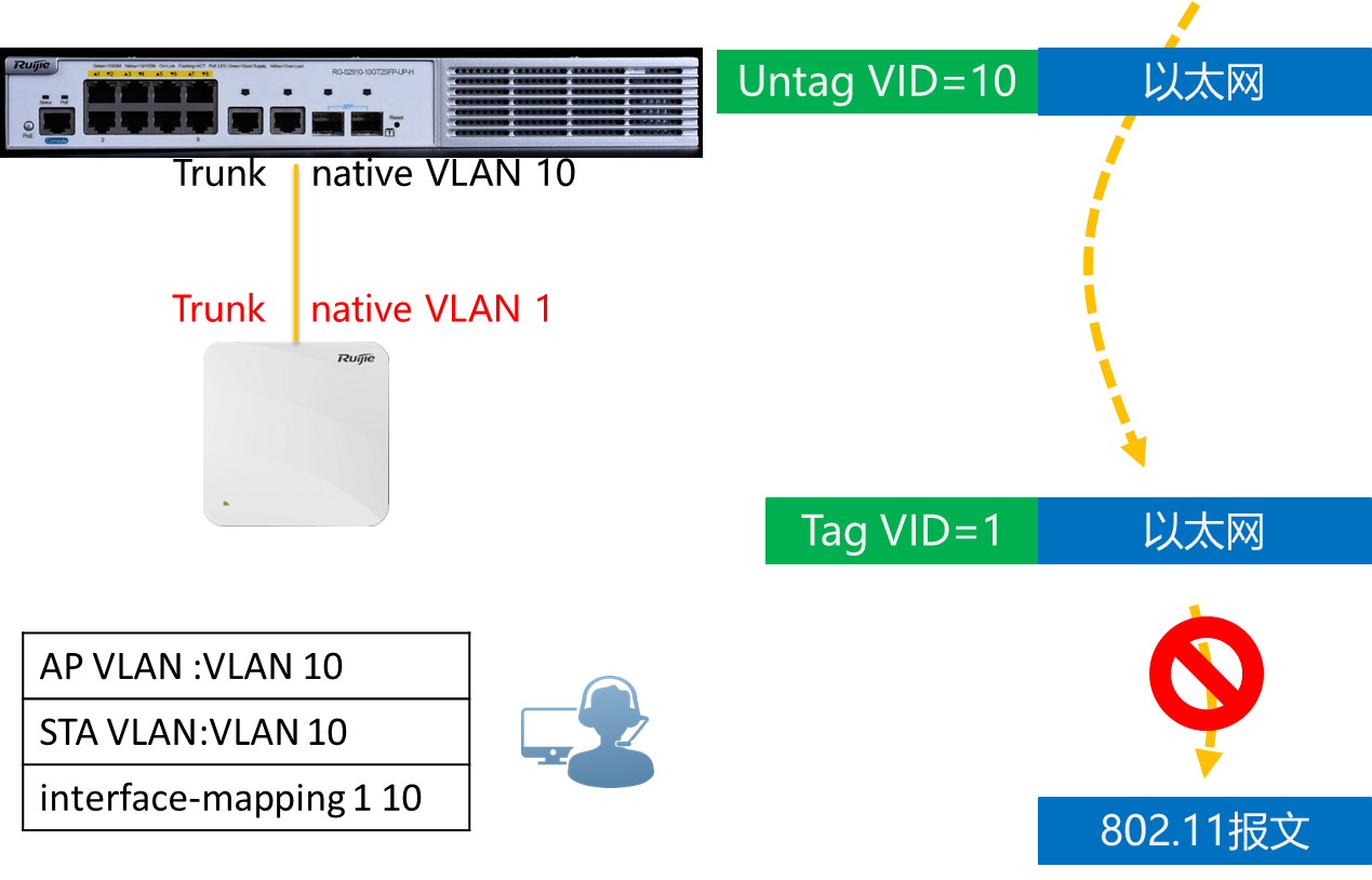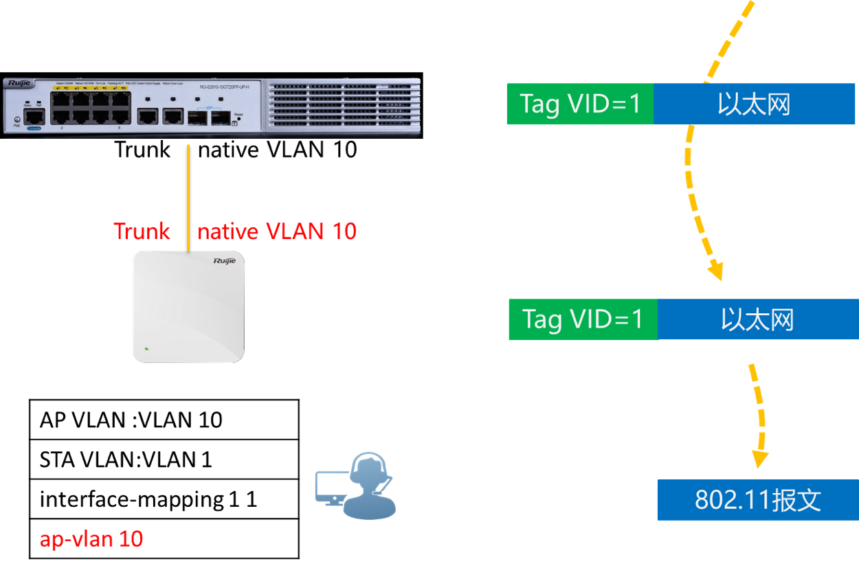 第二个方法是将用户的 VLAN改为1,修改后上行数据AP以UNTAG 1标签转发,到达交换机后,交换机对不带TAG的帧,打上Native VLAN 10的标签,然后正常转发。