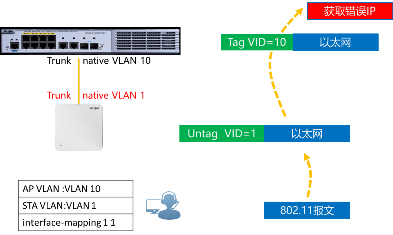在进行无线网络部署时,如果AP VLAN和STA VLAN使用相同VLAN时为何会出现无线用户会获取不到IP地址?如果STA VLAN为1而上联交换机配置的Native VLAN不是1时为何无线用户会获取到错误的IP地址?