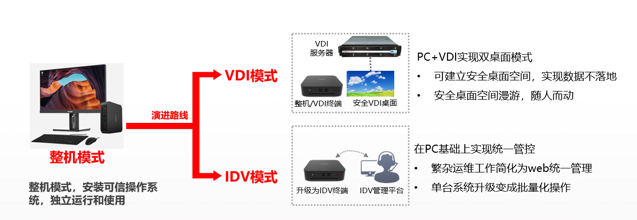 疫情之下,各行业依托各类“云”终端连接工作、学习和生活,这让RG-CT7800“平滑上云”特性得到了业界的广泛关注。据介绍,除了可作为PC终端独立运行,RG-CT7800还提供VDI+IDV两大云桌面模式。其中,IDV管理上云,可以对主机统一管理,高效维护终端桌面镜像,进而实现系统升级,以及快速还原等管理功能。而PC+VDI实现的双桌面模式,则可建立安全桌面空间,满足“数据不落地”的安全要求,同时还可利用桌面空间漫游特性,支持“数据随人走”的高效办公场景。