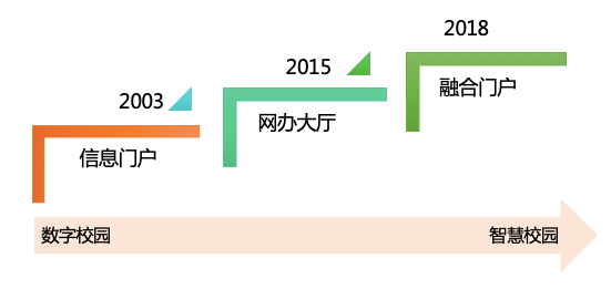 高校信息化历经校园网、数字化校园建设阶段,正在向智慧校园阶段大幅迈进。高校信息化门户——高校信息化资源与应用的集中承载、面向用户服务的入口,也经历了信息门户、网上办事大厅门户再到当前智慧校园下的融合服务门户三个阶段。