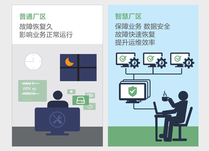 传统厂区采用普通PC进行办公,存在数据泄漏风险、运维管理难、故障恢复慢的问题。
