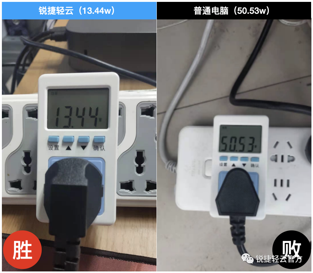 轻云在待机状态下耗电13.44w,比普通电脑在该状态下(50.53w)耗电降低73.4%,实测数据如下图。