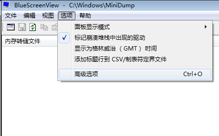 打开工具BlueScreenView,选择“选项”->“高级选项”。