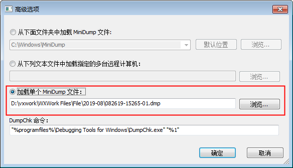 选择“加载单个MiniDump文件”,“浏览”保存的MiniDump文件(蓝屏MiniDump默认路径是C:\Windows\Minidump),这里文件夹dmp文件是基于系统默认小内存转储模式记录的内存数据。