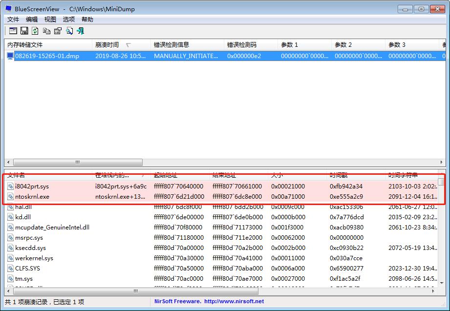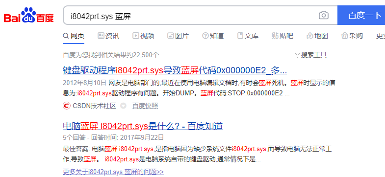 从图上我们可以看到引起蓝屏的程序进程是i8042prt.sys,通过百度查询确认是键盘驱动崩溃导致蓝屏。