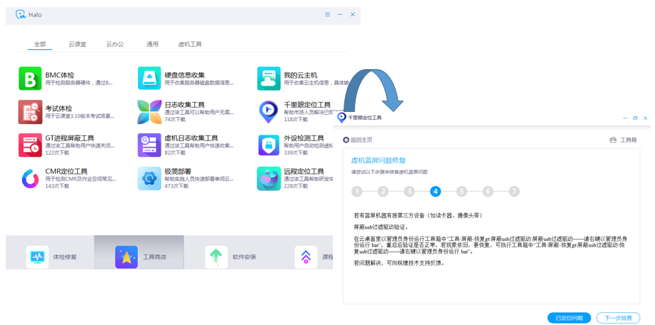 云桌面出现蓝屏情况,优先推荐使用HALO工具->工具商店->千里眼定位工具方法排查或者使用工具箱屏蔽GT脚本验证测试。