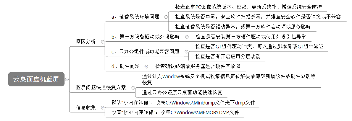 可通过收集蓝屏dump文件分析精确分析定位原因。系统默认“小内存转储模式”文件收集(C:\Windows\Minidump)简单分析蓝屏故障触发进程,以及设置“核心内存转储模式”文件收集(C:\Windows\MEMORY.dmp)深入分析故障环境下内存状态和卡死原因。